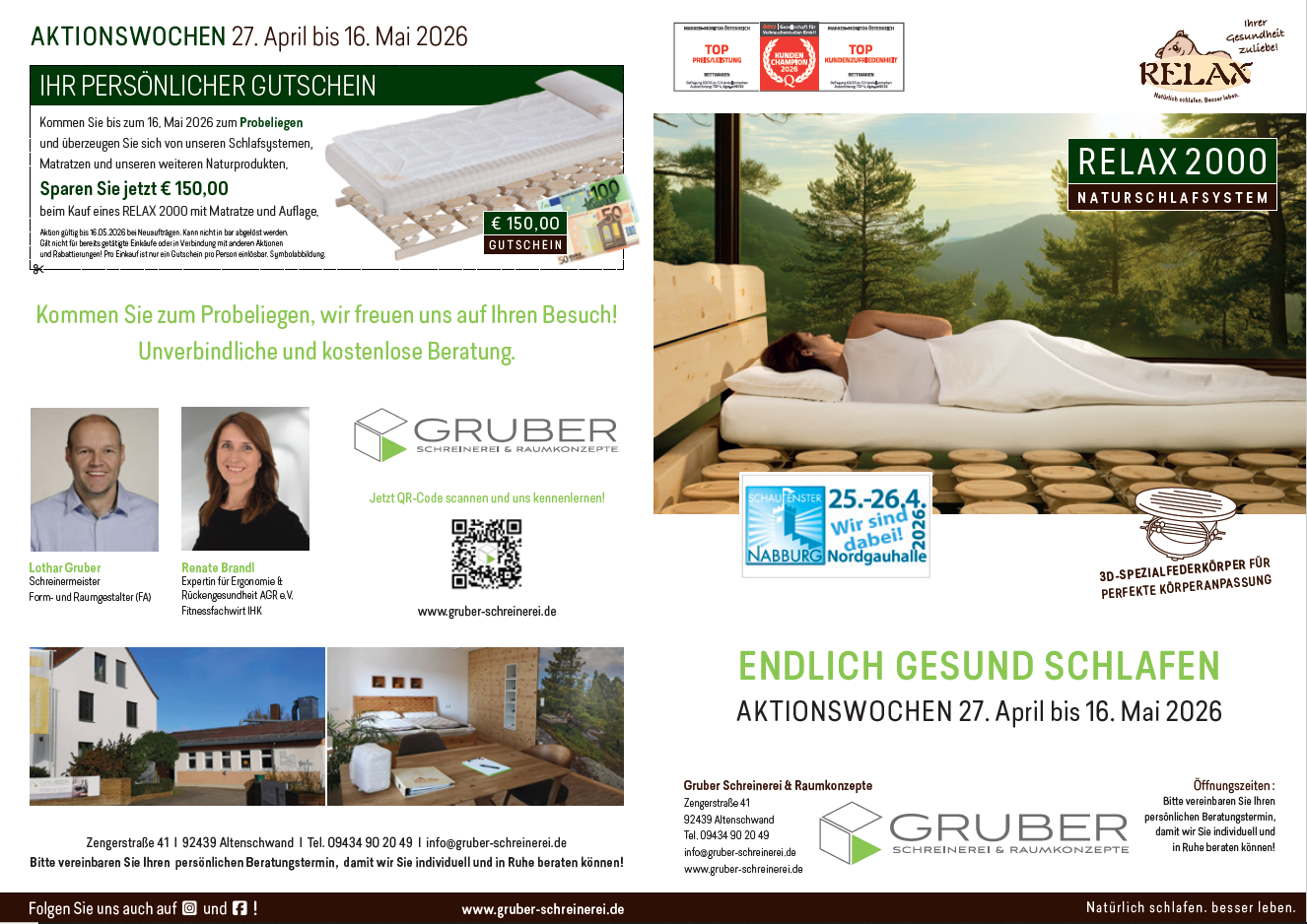 Ich bin Handelspartner der Firma Relax Natürlich Wohnen GmbH und begeistert von dem Bettsystem RELAX 2000. Gemeinsam mit Renate Brandl, langjährige Expertin im Bereich Rückenfitness und Gesundheitsförderung, biete ich Ihnen im Rahmen eines unverbindlichen Termins die Möglichkeit zum Probeliegen sowie die kompetente Beratung rund um das Thema „erholsam schlafen“. Vereinbaren Sie jetzt einen Termin und erfahren Sie, wie Sie spürbar gut schlafen!